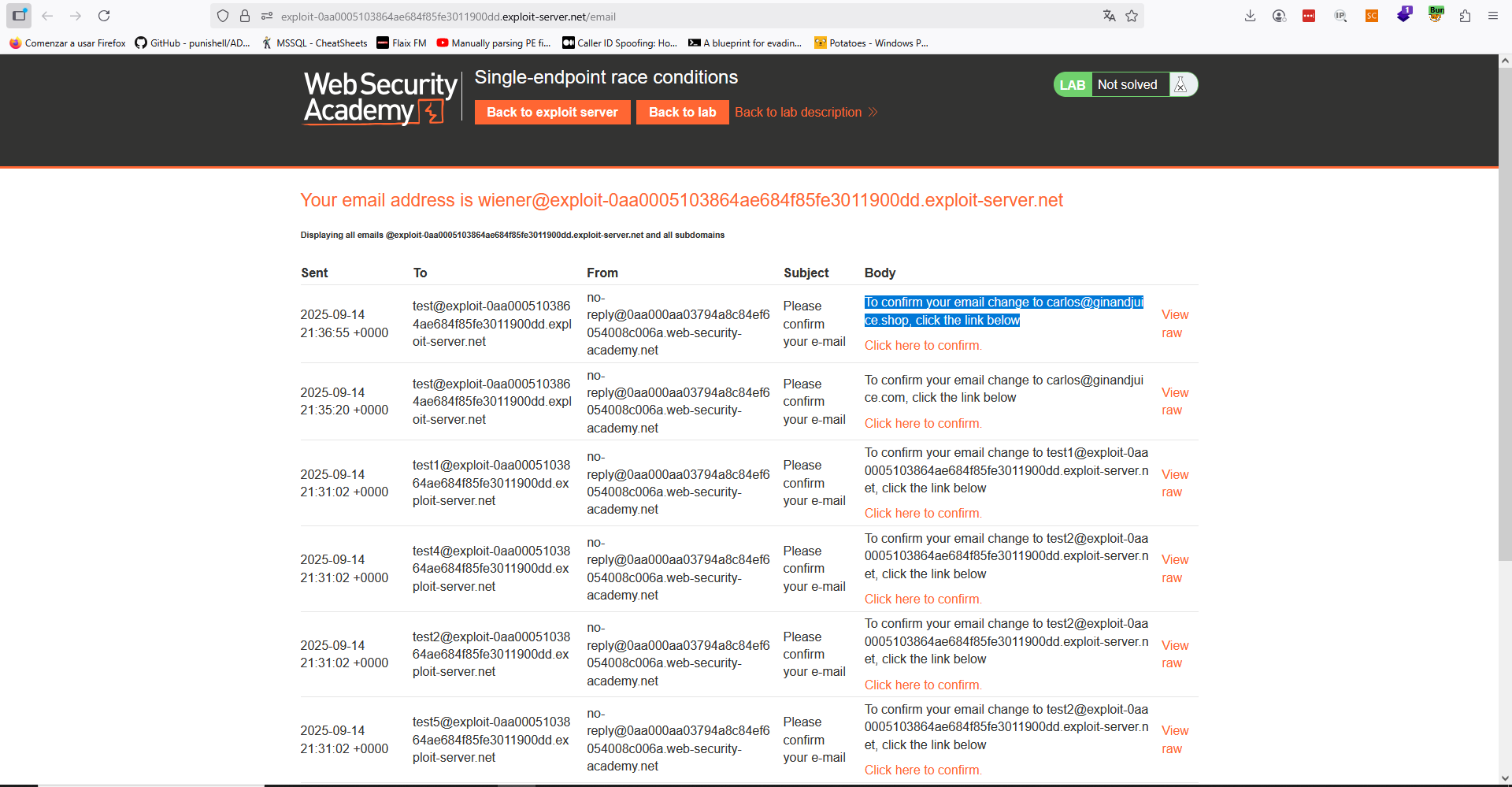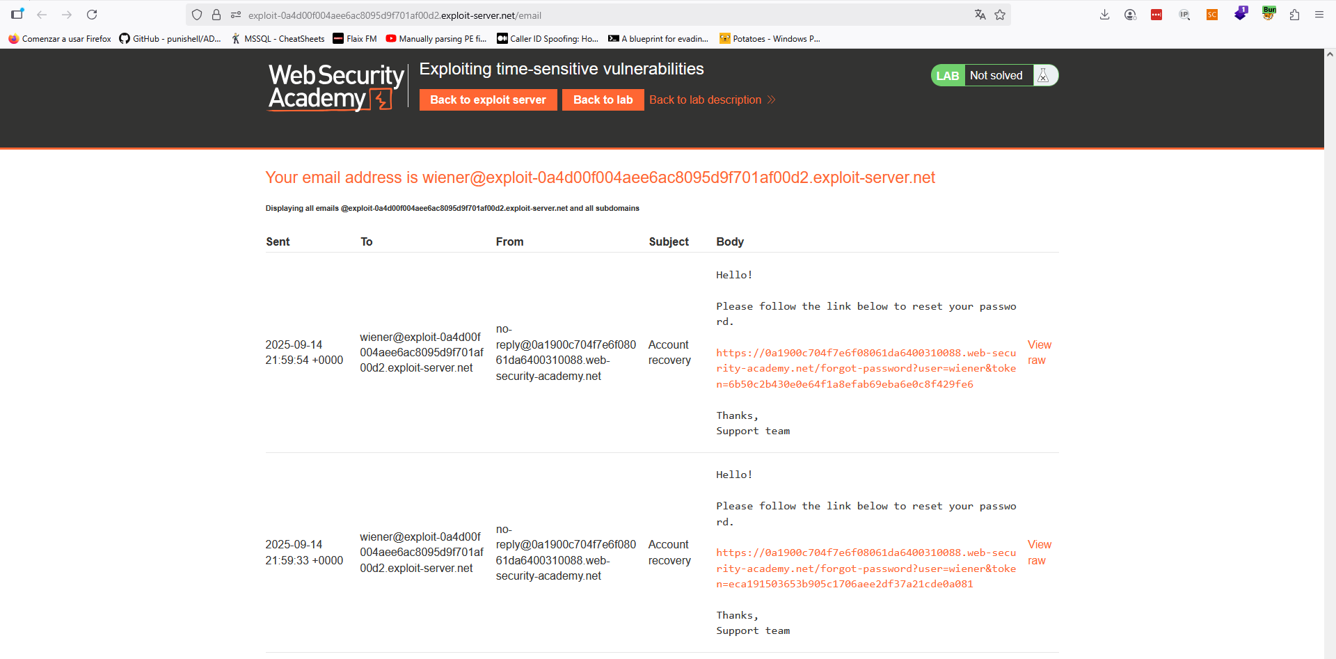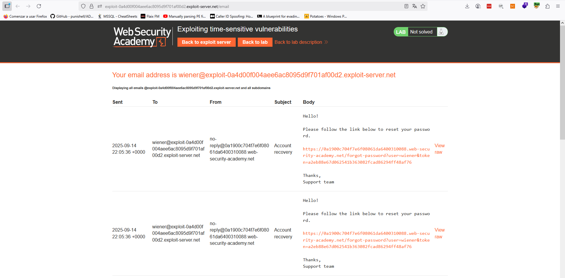 Conocido esto, podemos inferir que la generación del token para dos sesiones diferentes si se envían a la vez es idéntico. Por ello, procedemos ahora a repetir el ataque, pero enviando esta vez una petición para el usuario «carlos» y otra para el usuario «wiener». Recibimos, en el cliente de correo, una URL como la siguiente para el usuario «wiener»: