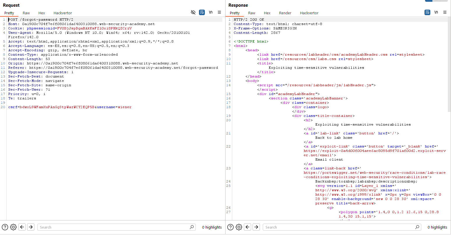 Del mismo modo, si intentamos enviar dos peticiones en paralelo, vemos que los tokens recibidos son igualmente diferentes. Sin embargo, debemos acordarnos que en lenguajes como PHP, solamente se atiende una petición por sesión. Por ello, capturaremos dos peticiones idénticas pero en sesiones diferentes y sus dos tokens CSRF asociados. Para ello, simplemente lanzamos una petición GET a «/forgot-password» sin cookies y obtenemos el valor de las nuevas cookies y del token CSRF.