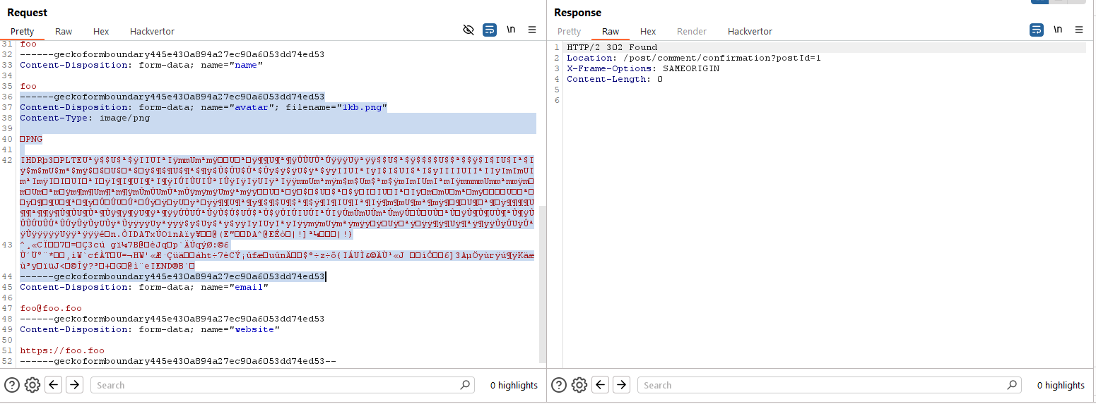 Mapeamos en primer lugar la superficie de exposición y vemos que en la petición enviada para subir un comentario a cualquier entrada del blog se incluye la posibilidad de subir un avatar. En principio, este avatar será una imagen: